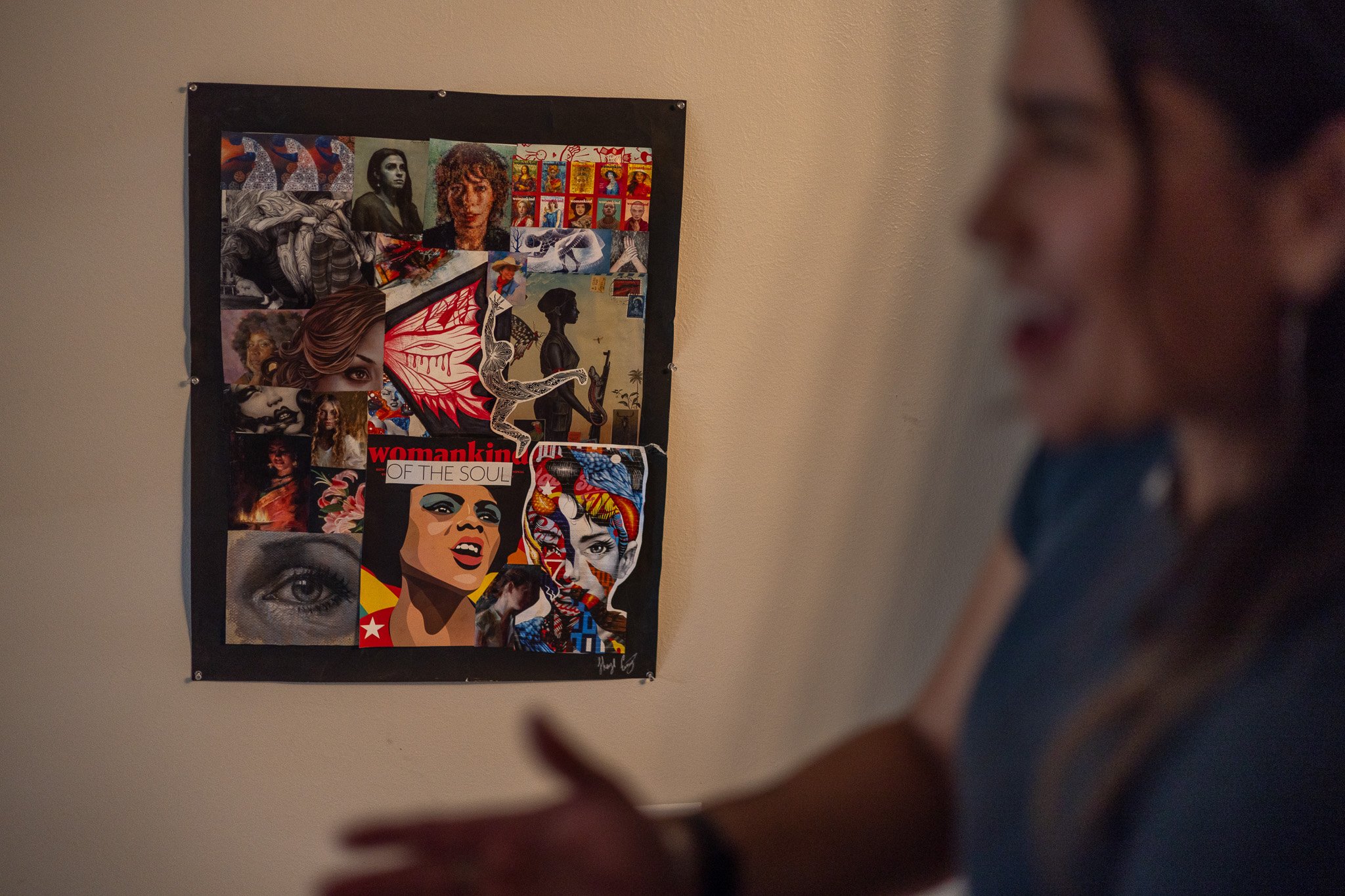 Popping off the wall is a red collage she made as a project for class representing how women are portrayed in society and the effect it can have on them. It’s completed by half of a butterfly she drew in the center of the piece, symbolizing that misinterpretation can go both ways and affect men just the same.